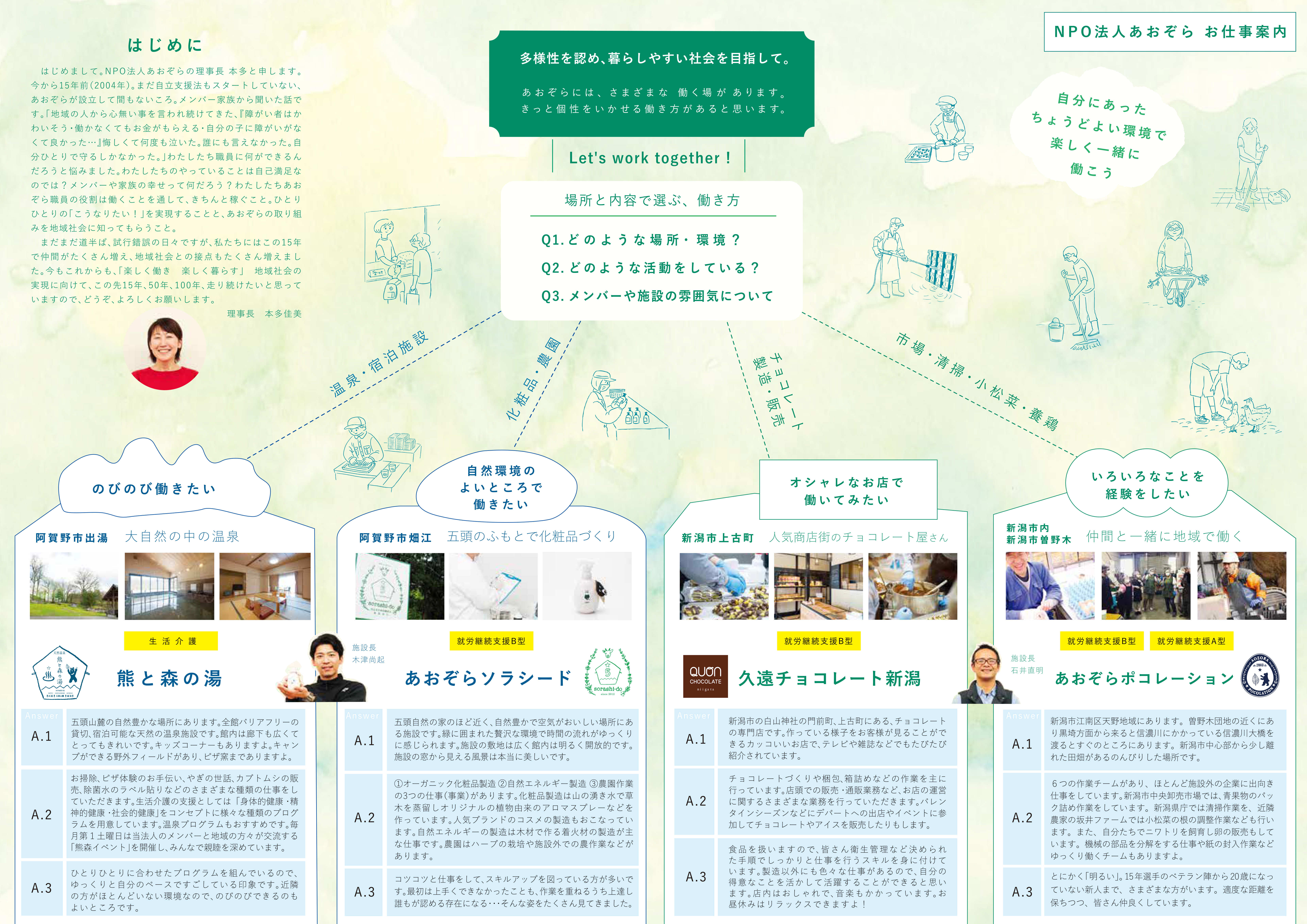 主な就労現場 ポコレーション・・・・・養鶏、清掃、請負業務等あおぞらソラシード・・・化粧品製造、自然農園等 久遠チョコレート新潟・・チョコレートの製造販売 熊と森の湯・・日帰り温泉、食堂、イベント開催等 |